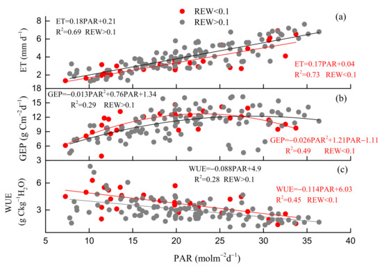 Responses of daily (a) evapotranspiration (ET), (b) gross ecosystem productivity (GEP) and (c) water use efficiency (WUE) to photosynthetically active radiation (PAR) under two kinds of relative extractable water content (REW) levels (REW > 0.1 and REW < 0.1) during the summer in 2017–2019.