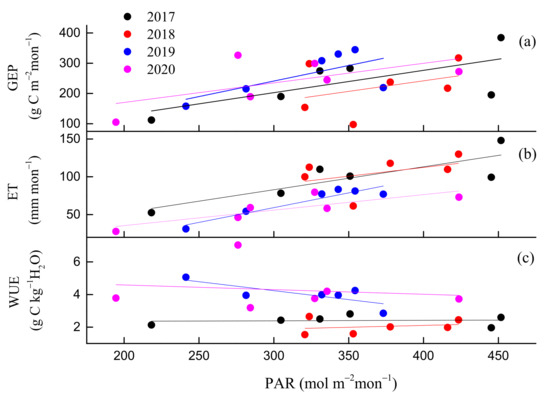 Responses of monthly (a) gross ecosystem productivity (GEP), (b) evapotranspiration (ET) and (c) water use efficiency (WUE) to PAR during the growing seasons from 2017 to 2020.
