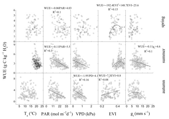 Relationships between daily water use efficiency (WUE) and daily environmental factors (Ta, PAR, VPD) and biological factors (EVI, midday gs) in three seasons (spring, summer, autumn) from 2017 to 2020.