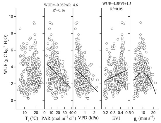 The relationships between GEP, ET, WUE and environmental and biological factors were expressed using linear or quadratic polynomial regression formulas. Coefficient of determination was used to express the strength of the correlation between two variables. All the relationships shown were statistically significant (p < 0.01).