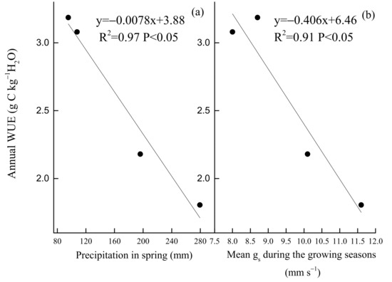 In contrast, the key environmental and biological factors that control WUE were PAR and EVI, PAR and gs, VPD and EVI, PAR and EVI, respectively, in spring, summer, autumn (Figure 11), and all of the growing seasons (Figure 12). Annual WUE had negative, linear relationships with precipitation in spring (R2 = 0.97, p < 0.05) (Figure 13a) and mean surface conductance (gs) (R2 = 0.91, p < 0.05) during the growing seasons (Figure 13b). Furthermore, a significantly negative relationship between the instantaneous gs and VPD in summer was observed in 2019 (Figure 14c) and 2020 (Figure 14d), but was positive in 2017 (Figure 14a). Daily gs decreased with VPD in 2018, when VPD was >1 kPa (Figure 14b). Gsref was 0.52 in 2019 (Figure 14c) and 0.5 in 2020 (Figure 14d), respectively. The ratios between m and gsref were 0.21 and 0.3 in the summer of 2019 and 2020, respectively.
