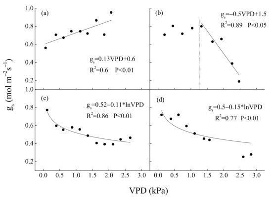 Relationships between mean surface conductance (gs) at midday and VPD in summer (June–August period) in (a) 2017, (b) 2018, (c) 2019 and (d) 2020. Half-hourly gs was bin-averaged every 0.2 kPa-interval of VPD.