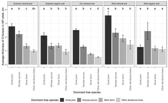 Average thickness of the O horizon in forest land in Latvia by dominant tree species (Scots pine (Pinus sylvestris L.), Norway spruce (Picea abies (L.) H.Karst.), silver Birch (Betula pendula Roth) and other deciduous trees). The division into groups based on soil types and moisture conditions is based on forest site types according to the national forest classification. Error bars represent standard errors. Different lower-case letters show statistically significant differences (p < 0.05, α = 0.05) in average values between different dominant tree species within a group of soil type and moisture conditions.