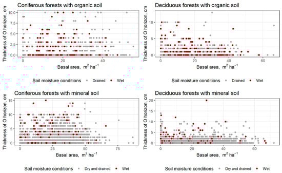 In hemiboreal forests in Latvia, the highest average thickness of the O horizon was detected in coniferous forests with wet mineral soil. The average thickness of the O horizon in forests with mineral soil decreased with increasing soil fertility, but forest stand characteristics were weak predictors of O horizon thickness. By contrast, in forests with organic soil, higher O horizon thicknesses were found in drained soils than in wet soils, indicating that accelerated organic matter decomposition in drained soils [,,] can be compensated by increased tree biomass growth followed by higher litter production rates [,] as a result of increased soil fertility after drainage [].