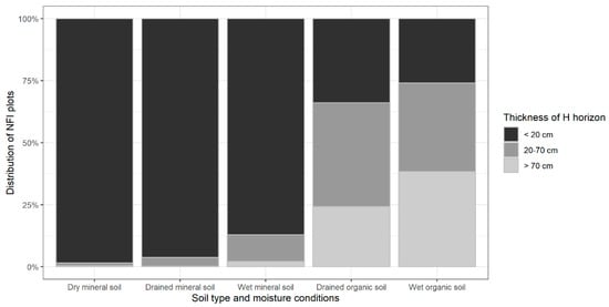In total, in forest land with mineral soil, the thickness of the H horizon was >20 cm in 3.5% of all NFI plots; relatively higher proportions were detected especially in wet mineral soils where the thickness of the H horizon was >20 cm, making up 12.9% of all NFI plots with wet mineral soils (Figure 5). In forest land with organic soils, as expected, the thickness of the H horizon was >20 cm in most NFI plots; nevertheless, in a relatively high proportion of NFI plots, the thickness of the H horizon was <20 cm (33.9% of all NFI plots with drained organic soils and 25.9% of all NFI plots with wet organic soils). The thickness of the H horizon was >70 cm in 0.6% of all NFI plots classified as plots with mineral soils, in 24.3% of all NFI plots classified as plots with drained organic soils and in 38.0% of all NFI plots classified as plots with wet organic soils (Figure 5).