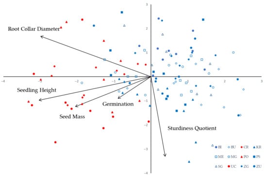 Biplot of principal component analysis based on seed mass, gemination and seedling characteristics in the 12 studied sweet chestnut populations. Population ID: BU—Buje; CR—Cres; PO—Poreč; UC—Učka; BI—Bilogora; KR—Krndija; ME—Medvednica; MG—Moslavačka gora; PS—Psunj; SG—Samoborsko gorje; ZG—Zrinska gora; ZU—Žumberak.