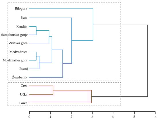 The first two components from the principal component analysis explained 38.21% and 28.02% of the total variation, respectively (Table 2). The first principal component (PC1) was highly negatively correlated with seedling height and root collar diameter, and moderately negatively with fruit size. The second principal component (PC2) was strongly negatively correlated with the sturdiness quotient, and moderately positively with the root collar diameter. From the biplot on Figure 1, it is quite evident that the coastal Mediterranean populations are associated with larger seeds and seedlings, and the continental populations with smaller seeds and seedlings. However, population Buje was somewhat specific, characterized by unexpected values of seed size and seedling growth. Although biogeographically related to the rest of the Mediterranean populations, population Buje was characterized by smaller nuts and smaller seedlings, and it showed similarity and linkage to the populations from the continental region (Figure 2). This curious fact can be attributed to previously published results by Poljak et al. [33]. The mentioned authors [33] revealed that the Mediterranean population Buje exhibits clear genetic differentiation from other Croatian coastal populations. A similar effect of genetic variability on seedling growth was noted for several other species [34,35,36,37].