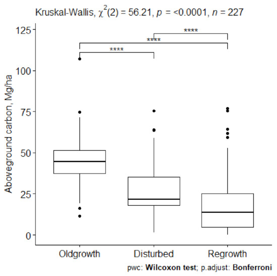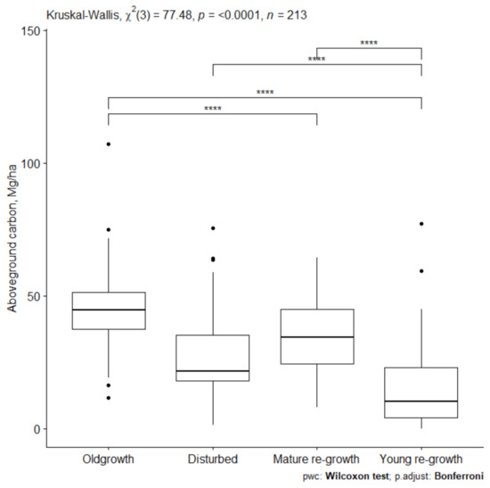 Aboveground carbon differed significantly between all three woodland categories (K-W ANOVA: p < 0.001) (Figure 2).