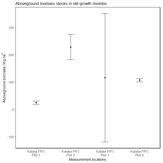 This case study data set is from [24], but more detailed information about the site is found in [25]. The site is a miombo woodland within the Kataba Forest Reserve (FR) in the Western Province of Zambia. Some extractive activities were permitted in the reserve [24]. Four plots of 50 × 50 m and numbered one to four were established to follow a degradation gradient from highly disturbed (1; cf. Figure 4), via slightly disturbed (two and three; forest edge effects), to undisturbed (four; in the core area of a forest reserve established in 1973). AGB was measured in 100 subplots of 5 × 5 m per plots, resulting in a 100% sampling coverage. It is not clear when the plots were sampled, but assuming it was closely before the publication year of 2011, the reserve had had more than 30 years to recover and, consequently, plot four showed no signs of disturbance. However, disturbance from forest edge effects was high in plots two and three; plot one, outside of the reserve, had been strongly degraded by logging and charcoal production during the three years prior to their study, with few trees remaining, but some shrubs and grasses were recovering in the area. All plots were on Arenosols, but they differed in height, tree density, and species composition [24,25].