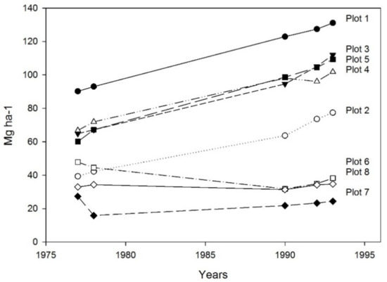 Several studies in the database provide longitudinal data on old-growth miombo woodlands from the Kitulangalo Forest Reserve in the Morogoro region of Tanzania. In 1985, the area was established as a reserve with restrictions on wood harvest which, in 1995, was completely protected from any extractive activities [27]. Eight permanent sampling plots were established and measured for biomass density in 1977 by Kielland-Lund [28]. Another study repeated the biomass measurements at the same sites over a period of 15 years [29] (Figure 5). These observations are cited in [27]. Note the case study is in biomass units, not carbon.