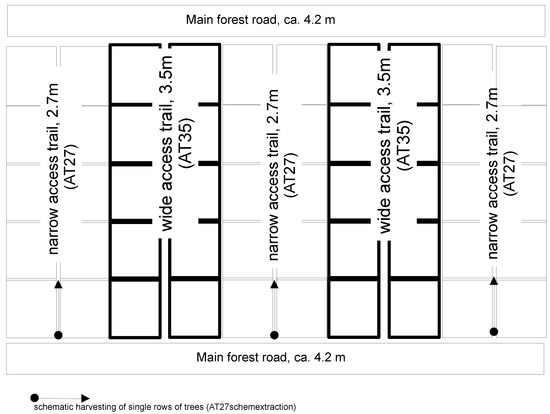 In the second phase, narrow-access trails were made by schematic extraction of single rows of trees (AT27 schemextraction). Due to the relatively low ground clearance of the mini-harvester (310 mm, Table 1), the remaining stumps had to be removed, and the trail leveled by a mounted blade.