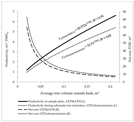 The general results (Table 6) indicate the absence of statistically significant differences in mini-harvester productivity between sample plots along wide (AT35) and narrow access trails (AT27). Therefore, the two types of sample plots were combined with net cost and productive analyses (Table 7, Figure 2). However, a more accurate analysis of performance models showed up to 12% higher productivity on narrow trails (AT27) for the same tree volume (Table 8).
