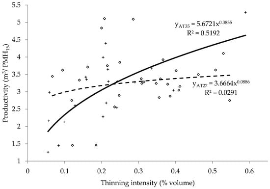 Analysis of marginal productivity functions (Figure 3) showed higher average productivity for sample plots along the wide access trails (AT35; R2adj. = 0.5192, F = 8.304, p = 0.008) at thinning intensity greater than 23%, while at lower thinning intensity higher productivity was observed for sample plots along the narrow access trails (AT27, R2adj. = 0.0291, F = 0.840, p = 0.367, not significant).