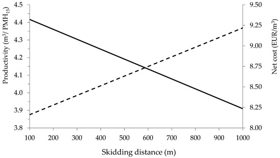Analyses showed that during a one-shift work system (8 h/day, 210 days/year) machine usage was rather low and did not exceed 65%. The estimated net machine cost (excluding profit margin, Table 9) for the forwarding equipment was EUR 36.12/PMH, and that for the mini-harvester EUR 52.47/PMH. Under these conditions, the total harvesting cost was EUR 25.11/m3. At an average tree volume of 0.08 m3, the corresponding estimated mini-harvester cost ranged from EUR 17.7 to 20.9/m3 (Figure 2). Furthermore, for a distance of 300 m, the expected productivity of the forwarding equipment was 4.29 m3/PMH15 with an estimated net cost of EUR 8.4/m3. The lines in Figure 4 were indicate the average productivity and cost for the forwarding equipment as a function of distance by average, constant speed, and fuel consumption (Table 1).