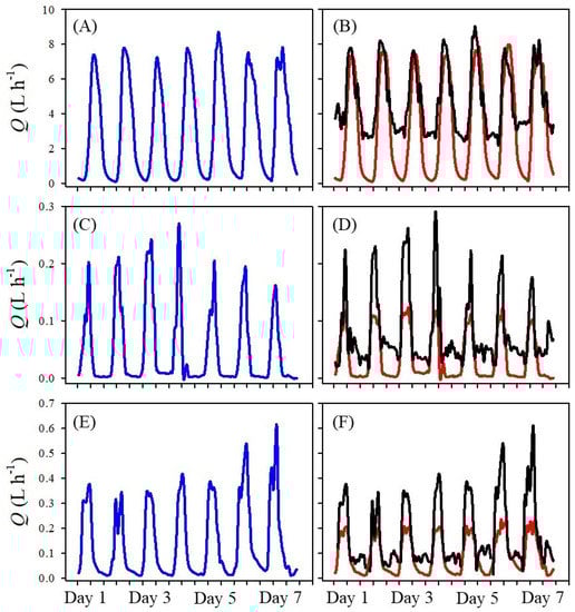 An example 7-day subset of total tree sap flow (Q, L h−1) data for (A,B) P. communis, (C,D) S. floribundum, and (E,F) S. paniculatum highlighting the measurement range differences for the three sap flow methods. (A,C,E) Dual method approach (DMA, blue line), (E,D,F) heat ratio method (HRM, red line) and Tmax method (black line).