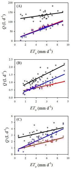 Total plant volumetric sap flow (Q) is the movement of fluid within xylem and is functionally correlated with transpiration, stem refilling and transport of solutes. In contrast, reference evapotranspiration (ETo) is the transfer of water vapor from a land surface covered by a hypothetical grass with a uniform height of 0.12 m [,]. Despite the fundamental difference in definition between Q and ETo, there is a significant positive correlation between the variables (e.g., [,,,]).