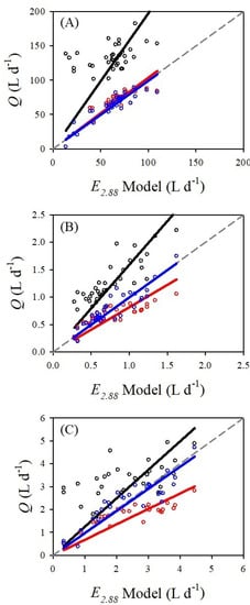 The E2.88 model estimates maximum potential plant water use that is driven by atmospheric evaporative demand based on the assumption that all other conditions are non-limiting [,]. The non-limiting assumption may prove useful because it provides a null model against which measured Q can be compared. For example, if Q is not equal to the E2.88 model then, by inference, Q is not equal to atmospheric evaporative demand and some other biophysical or physiological component is the limiting factor. Experimental designs or comparative studies can explore potentially limiting factors to Q. For instance, Pereira and Villa Nova [] used the E2.88 model to experimentally test phenological and biophysical effects of water use in Tahiti acid lime; and Fernández et al. [] used the E2.88 model in a study on regulated deficit irrigation.
