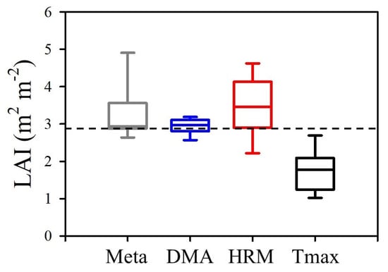 Box plots showing the median, 25th and 75th percentiles, and whisker caps representing the 5% and 95% confidence intervals, for the slope of the linear relationship between Q and ALETo/2.88. The null hypothesis value of 2.88 (black dash) is derived from the E2.88 model and represents the leaf area index (LAI) of the reference grass crop in the Penman–Monteith ETo model. The box plots summarise results from the data compilation (Meta, grey box, see Supplementary Table S1 for details), and the three species from this study measured via the dual method approach (DMA, blue box), heat ratio method (HRM, red box), and Tmax method (Tmax, black box).