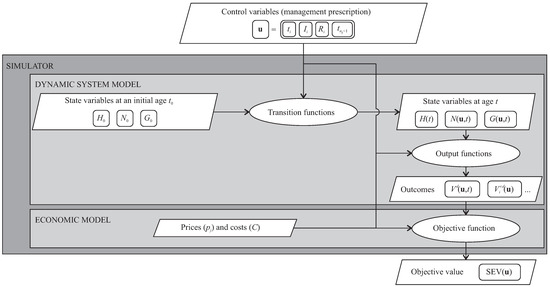 We optimized forest stand management following a similar methodology to that used by Arias-Rodil et al. [26] in the NW of Spain for pure, even-aged stands of Pinus pinaster Ait. In it, the development of a forest stand is simulated using the dynamic systems-based framework (frequently referred to as “state-space” approach) first used in forestry by García [27]. According to it, the forest stand is characterized at each moment by state variables whose evolution, described by time-dependent transition functions, is considered independent of previous states. These functions represent natural dynamics (growth and mortality), are affected by control variables which encapsulate the impact of silvicultural treatments on the state, and are complemented by output functions that translate state variables into outcomes (e.g., timber volume). An economic model provides the objective function value corresponding to these control variables and initial stand conditions (see Figure 1).