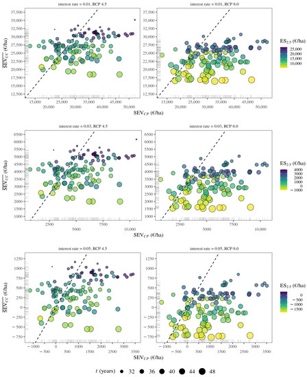 The resulting SEV under optimum silviculture for current productivity varied from −1150 €/ha (for r = 0.05) to ∼52,000 €/ha (for r = 0.01), with a mean value of 12,800 €/ha. Concerning climate change scenarios, the ranged, overall, from −750 to ∼35,000 €/ha with a mean value of 10,500 €/ha for RCP 4.5 and 9000 €/ha for RCP 6.0. With regard to the tails of the distribution, the ES varied from −1800 €/ha to 27,000 €/ha, while the ES varied from 130 €/ha to 56,000 €/ha. Plots of SEV under current productivity vs. SEV under climate change for each interest rate-RCP combination are shown in Figure 2.