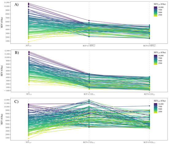 Parallel coordinates plots representing the change from SEV under current productivity () to (A) mean SEV under climate change (), (B) future ES and (C) future ES for an interest rate = 0.03.