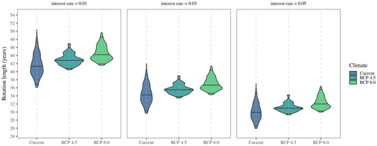 Violin plot of optimum rotation length vs. climatic scenario (Current productivity, RCP 4.5 and RCP 6.0).