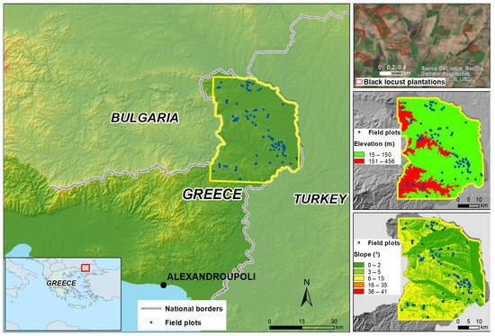 The short-rotation black locust plantations under study are located in northeastern Greece in the northern part of the Evros regional unit (Figure 1). Black locust plantations have covered approx. 44% of the total agricultural afforested area in Greece since the introduction of national Regulations 2080/92 and 1257/99 under the implementation framework of EU CAP [24]. Black locust is a fast-growing species that produces large amounts of biomass and high-density wood; it can also conserve soil and water, fixes soil nitrogen, and presents strong adaptability on low fertility soils, making it ideal for marginal land exploitation [25].