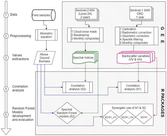 The methodological approach of the present study for modeling the AGB of black locust consists of five main steps (Figure 2). In the first step, data are collected by performing field measurements on survey plots and by filtering the Sentinel-2 and Sentinel-1 image collections to create seasonal time-series. In the second step, the initial datasets undergo preprocessing by utilizing an allometric equation for AGB calculation from field measurements and by generating monthly composites from Sentinel-2 and Sentinel-1 filtered imagery. The third step involves the calculation of multispectral indices along with the value extraction from both multispectral indices and radar backscatter (VV and VH) for each survey plot. In the fourth step, Spearman rank correlation analysis is applied to the multispectral and radar variables in order to explore the correlation between each variable and the ABG for each month. Finally, in the last step, random forest models are developed using four different datasets, spectral variables, and the synergetic use of Sentinel-2 and Sentinel-1 variables. The flowchart diagram in Figure 2 presents a general description of the processing steps of our research.