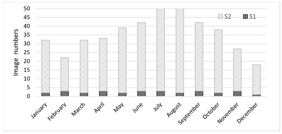 A Sentinel-1 dataset was also retrieved and processed by the GEE, consisting of 29 ground range detected (GRD) C-band SAR images of interferometric wide (IW) swath mode and VV and VH dual-polarization acquired between January 2020 and December 2020 (Figure 3). The images were of descending pass, and all of them belonged to the same relative orbit (i.e., 109). Regarding preprocessing, each 10-m scene was initially calibrated into σ0 backscatter coefficient values and despeckled using a 5 × 5 Lee filter, while terrain correction involved the use of SRTM 30 [30]. The final step involved the conversion of pixel values into decibels (dB), according to the following Equation (3):