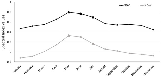 Time-series of the seasonal variation of Normalized Difference Vegetation Index (NDVI) and Normalized Difference Water Index (NDWI) indices derived from Sentinel-2 images.