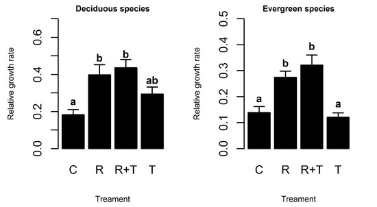 3.2. Effects of Treatment on the Seedling Relative Growth Rate