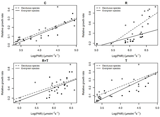 The seedling RGR of deciduous and evergreen species was positively correlated with PAR (Figure 2, Table 2). The seedling RGR increased significantly with the increase in PAR in all four of the treatments. The seedling RGR of deciduous species was higher than that of evergreen species, especially in the vegetation removal treatment.