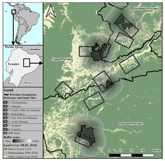 Geographic area and study site selection used in this analysis came from a project conducted in Ecuador between Thünen Institute and local partners [43,47,48,49,50]. Selected study sites (see Figure 1) are located in the provinces of Napo, Pastaza, and Orellana. These provinces contain approximately 44% (5.5 Mha) of the total forest area in Ecuador [51]. In these three provinces there is more than 1 Mha of land under SBP, which represents approximately 63% of the total SBP area in Ecuador for 2018 [52].