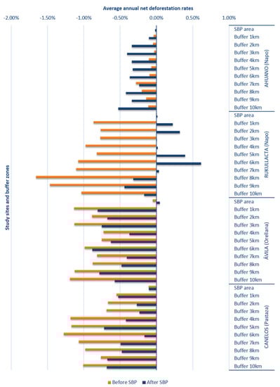 We detect that forest cover changes (decreases and increases in net deforestation rates) in SBP areas happen in the same direction as in the surrounding areas. For example, Ahuano had the highest deforestation rates in its buffer zones after SBP implementation, which increased over time. In the same direction, Ahuano showed a slight increase in deforestation within the SBP area as well. All other SBP areas showed a decrease in deforestation rates after SBP implementation. This decrease was also observable in the surrounding buffer zones, which maintained, however, a high rate of deforestation. Only in the buffer zones of Rukullacta did reforestation occur after SBP implementation, up to the 7 km buffer zone.
