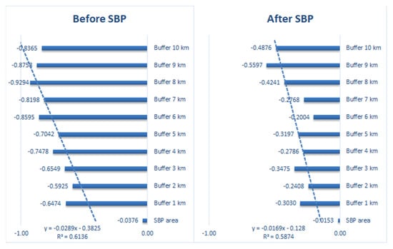 We also tested whether there exists a correlation between net deforestation rates and distance in the SBP areas and the ten 1 km buffer zones. Before SBP implementation, the results indicate a correlation of −0.7833 (p ≤ 0.01; CI between −0.920 and −0.201), and after SBP implementation, a correlation of −0.7664 (p ≤ 0.01; CI between −0.914 and −0.164). In the absence of more precise data, we also conducted two standard linear regressions with a constant between net deforestation rates and distance. Our interest in the results (see Table 4) from these regressions lay in the coefficient of distance.