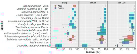 Survival performances of native and alien tree species planted at three trial sites in Northeastern Mindanao, Philippines. Native species are green color boxes and red indicates alien species. In the box plot, the thick vertical line shows the median, and the box extends to the left for lower quartiles and to the right for the upper quartiles. Horizontal thin lines indicate the nominal range, open circles indicate points that lie outside the nominal range.