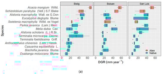 It is not surprising that alien species A. mangium attained the highest DGR (mean = 61 mm year−1) across all sites (Figure 4a). Following A. mangium were alien species S. parahyba and S. macrophylla with a DGR of 38 mm year−1 and 31 mm year−1, respectively. Native species such as A. macrophylla, E. deglupta, P. javanica, and M. dubia, with DGR ranging from 32–35 mm year−1, grew at rates close to that of S. parahyba and S. macrophylla. The species with the lowest DGR was attained by D. moluccana (14 mm year−1).