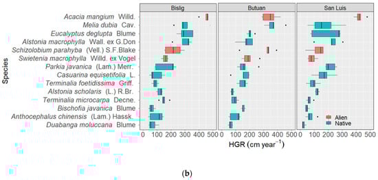 DGR (a) and HGR (b) of native and alien tree species planted at three trial sites. Native species are green color boxes and red indicates alien species. In the box plot, the thick vertical line shows the median, and the box extends to the left for lower quartiles and to the right for the upper quartiles. Horizontal thin lines indicate the nominal range, open circles indicate points that lie outside the nominal range.