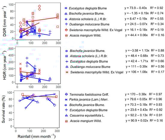 Relationships between DGR, HGR, and survival rate to rainfall. Native species are represented by blue symbols and lines and red indicates alien species. Each symbol represents the average data per species per plot in each trial site. Linear regression equations are presented after each species in the legend in the right side of each panel.