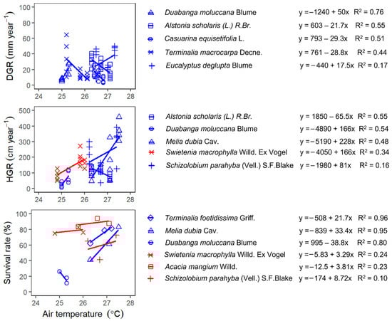 Relationships between DGR, HGR, and survival rate to air temperature. Native species are represented by blue symbols and lines and red indicates alien species. Each symbol represents the average data per species per plot in each trial site. Linear regression equations are presented after each species in the legend in the right side of each panel.