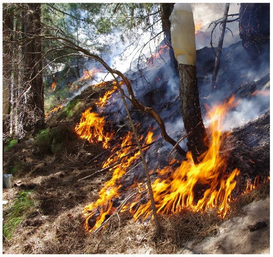 - Stephens, S.L.; Finney, M.A. Prescribed fire mortality of Sierra Nevada mixed conifer tree species: Effects of crown damage and forest floor combustion. For. Ecol. Manag. 2002, 162, 261–271. [Google Scholar] [CrossRef]