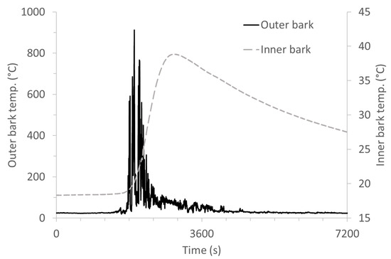 | Tree | Bark Thickness (mm) | Basal Diameter (cm) | Bark Tmax (°C) | Time to Peak (s) | Heating Rate (°C min–1) | |