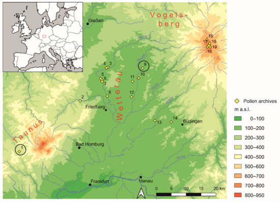 Map of the study region with previously published pollen archives: 1: Heftrich, 2: Usa valley, 3: Salzwiese, 4: Ober-Hörgern 2, 5: Rockenberg, 6: Oppershofen 5, 7: Opershofen 3, 8: Wisselsheim, 9: Moenchborn, 10: Widdersheim/Horloffaue, 11: Dorfwiese, 12: Echzell, 13: Heegheim, 14: Büches, 15: Sieben Ahorn, 16: Forellenteiche, 17: Breungeshainer Heide, 18: Goldwiese, 19: Lattenbruch). Black circles mark the two sites in the focus of this study.