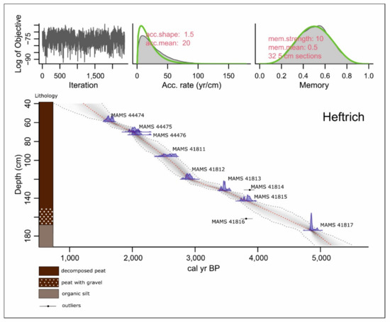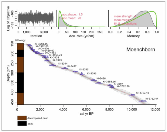 The absolute chronology of the profiles is based upon 18 14C dates from Moenchborn (Table 1, Figure 2), and 10 14C dates from Heftrich (Table 1, Figure 3). Age-depth modeling was performed with the R package Bacon 2.3.9.1 [44]. In the general discussion, the published data from other sites (Wetterau and Vogelsberg) were considered as well.