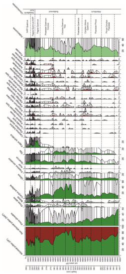 - Sugita, S. Theory of quantitative reconstruction of vegetation I: Pollen from large sites REVEALS regional vegetation. Holocene 2007, 17, 229–241. [Google Scholar] [CrossRef]