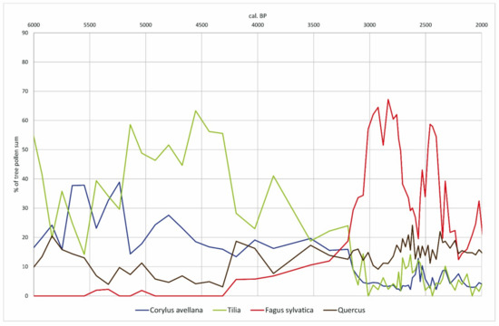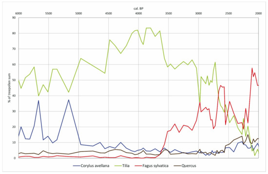 In order to determine the relevance of particular tree species under modified ecological conditions of the future and particularly as a basis for computer modelling, pollen records highlighting past vegetation formations during specific palaeoclimatic phases are especially suitable [19,30,31,32,33,34,35,36]. The parallelisation with past vegetation scenarios is complicated by the fact that anthropogenic influences have been an important driver of European vegetation dynamics since the mid-Holocene [37]. Existing models, however, often use data from the warm and humid Holocene Climate Optimum, before human disturbances started to seriously affect woodland composition [35,36]. Other investigations have targeted historical epochs, which do not go back beyond the Migration period (1700–1400 cal. BP) [38], thus relating to a time when the forests were already completely transformed by human impact and hence do not reflect the climatic trends expected for the future. Considering only the distributions of tree species over the last centuries may also result in the underestimation of the future potential of those taxa that have been persisting in anthropogenically reduced ecological niches for millennia, such as Tilia and Ulmus [32,35,36,39]. While their relative proportional population growth rates were negatively affected by intensified land use, those of Quercus, Fagus and Picea were positively affected [40], which is why the latter taxa are likely to be overrated in future simulations.