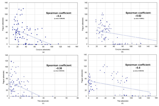 Here, we present the regional pollen percentage diagrams with selected pollen types from the locations Moenchborn (reduced to the relevant section from 9500 to 2000 cal. BP) and Heftrich (Figure 4 and Figure 5). The bivariate scatter plots and rank coefficients (Figure 8) show moderate negative correlations for Corylus-Fagus and Tilia-Fagus, but the diagrams also reveal that especially Tilia and Fagus tend to mutually exclude each other in many samples, demonstrating their general competition.