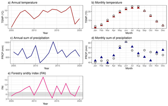 Temperature, precipitation, and forestry aridity index (FAI) on annual (a,c,e) and monthly (b,d) scales for two 30-year timespans: 1950−1980 (▲) and 1990−2020 (●). The shaded area in (e) represents optimal QURO stand conditions.