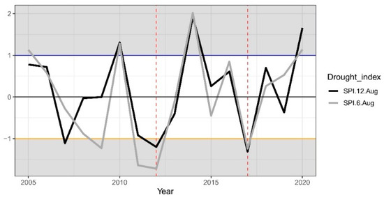 A 6- (gray) and 12-month (black) August standardized precipitation indices (SPIs) for the period 2005−2020. The threshold for wet events is indicated by a blue horizontal line; the threshold for dry events is indicated by a yellow horizontal line. The representative drought events are indicated with dashed red lines.