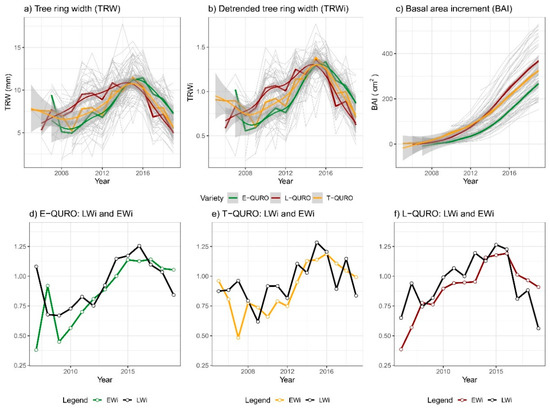 E-QURO, T-QURO, and L-QURO (a) measured and (b) detrended tree-ring widths, (c) basal area increments, and detrended early- and latewood chronologies for (d) E-QURO, (e) T-QURO, and (f) L-QURO.